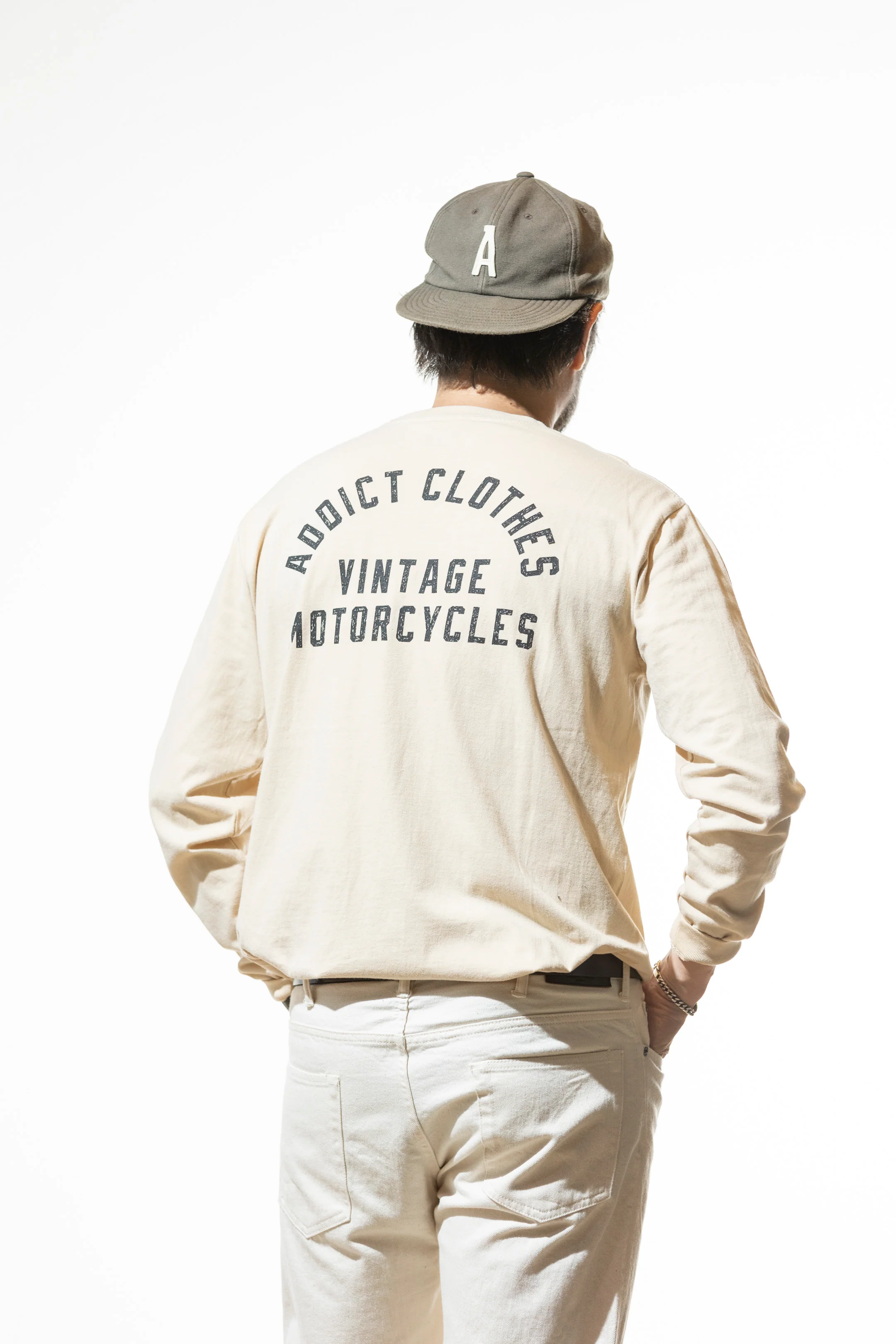 傾斜した胸ポケットが特徴的なバックプリントロングスリーブTシャツ